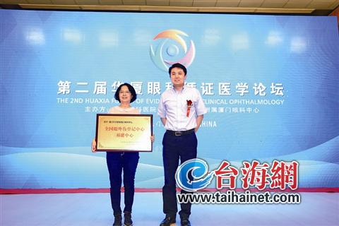 ▲蔡錦紅主任領(lǐng)取“眼外傷登記中心福建中心”牌匾