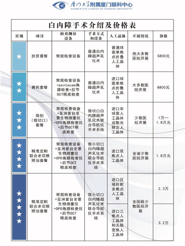 六大套餐價,兼顧優(yōu)質(zhì)和平價,患者可根據(jù)自己的需求自由選擇。套餐費用包含檢查費、手術(shù)費、人工晶體費、住院費、醫(yī)藥費等,省錢又省心。