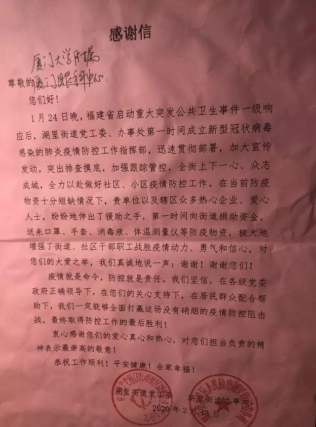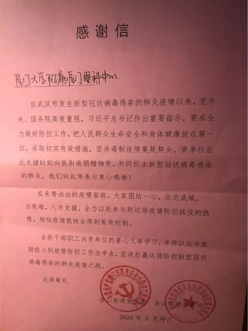 在中華街道辦,街道在LED大屏上打上了“感謝廈門大學(xué)附屬廈門眼科中心向中華街道捐贈護(hù)目鏡”;廈港街道辦為醫(yī)院頒發(fā)了榮譽證書;還有湖里街道辦、金山街道辦等街道也寫了一封封誠摯的感謝信。