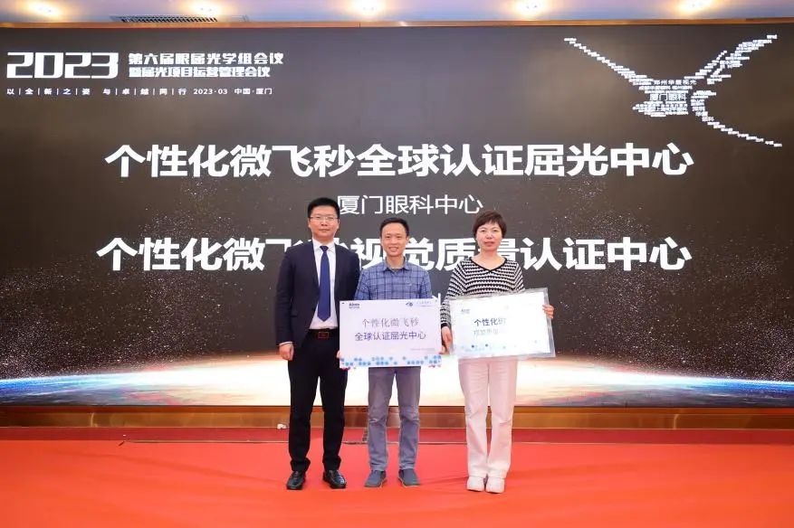 ▲ 愛爾康屈光產(chǎn)品事業(yè)部負(fù)責(zé)人王炯先生為廈門眼科中心頒發(fā)”個性化微飛秒全球認(rèn)證屈光中心“。