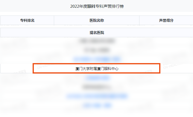 11月25日,由國(guó)內(nèi)著名同行專家擔(dān)任評(píng)審的復(fù)旦版《2022年度中國(guó)醫(yī)院綜合排行榜》和復(fù)旦版《2022年度中國(guó)醫(yī)院??坡曌u(yù)排行榜》在上海市發(fā)布。廈門眼科中心榮獲2022年度眼科專科聲譽(yù)排行榜提名,是全福建省唯一上榜的專科醫(yī)院,且已經(jīng)是廈門眼科中心連續(xù)第五年上榜!