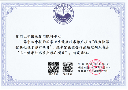11月25日,在廈門市醫(yī)院協(xié)會第三屆年會暨“學(xué)科引領(lǐng)高質(zhì)量發(fā)展”學(xué)術(shù)會議上,廈門大學(xué)附屬廈門眼科中心“視力快篩信息化系統(tǒng)”榮獲廈門市醫(yī)院協(xié)會第三屆“年度醫(yī)療十大創(chuàng)新技術(shù)”項目,同時“視力快篩信息化技術(shù)推廣項目”經(jīng)國家衛(wèi)生健康技術(shù)應(yīng)用推廣項目專家論證會論證,成功入選中國民族衛(wèi)生協(xié)會2023年度“衛(wèi)生健康技術(shù)重點推廣項目”。